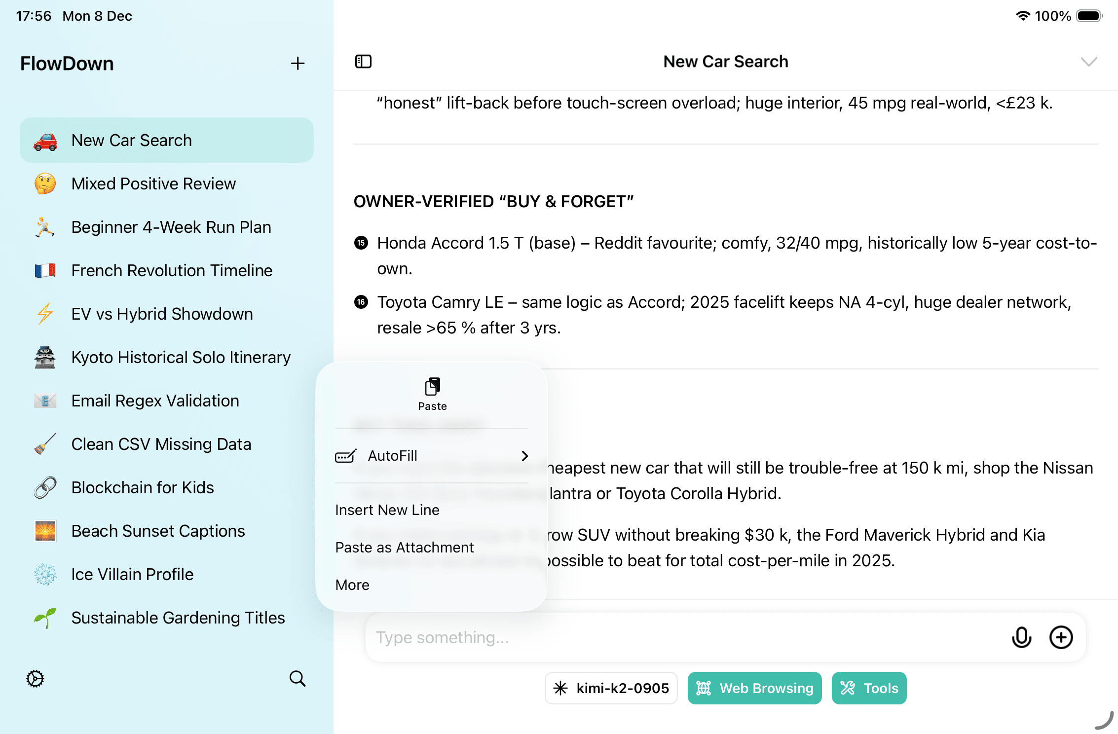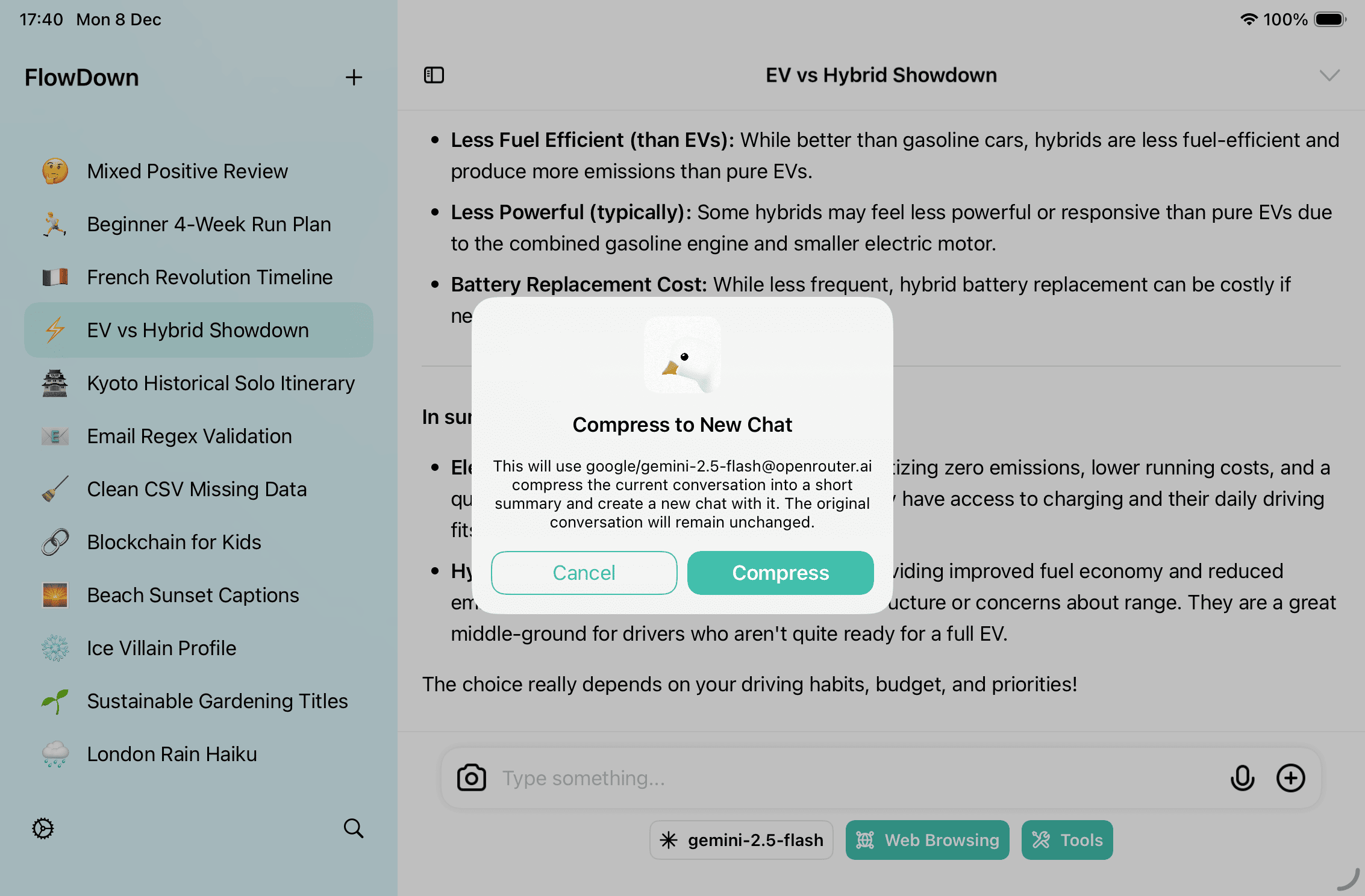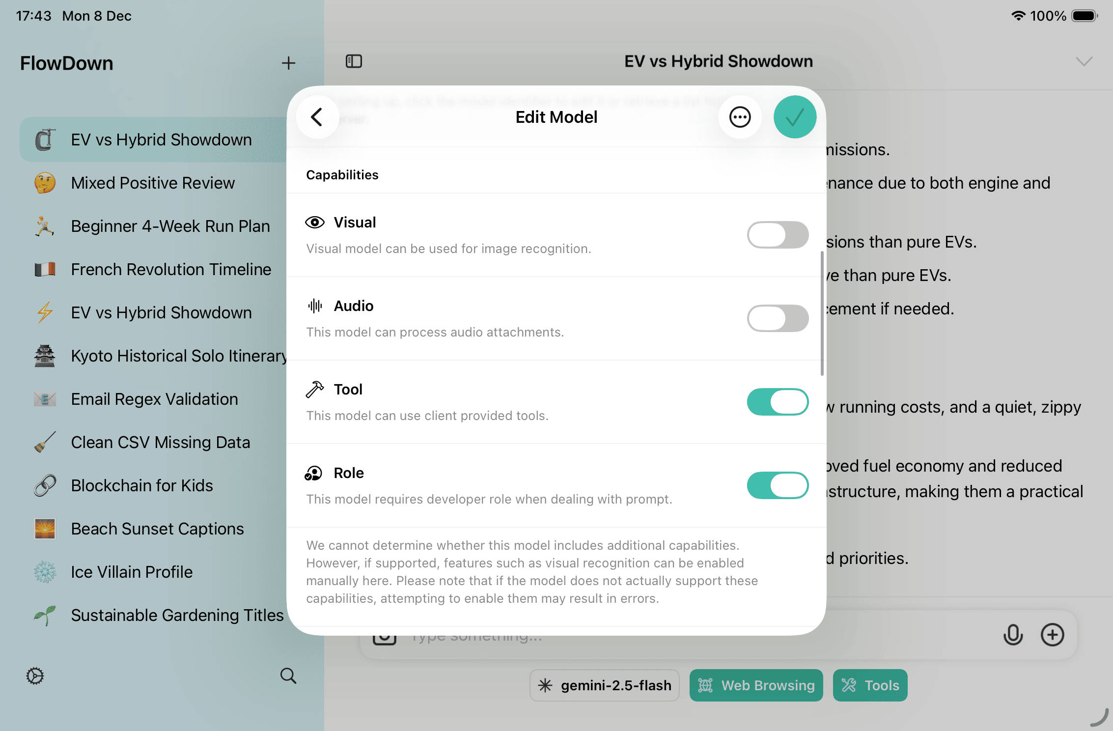 - Text-only models: FlowDown calls the Auxiliary Visual Model to turn images into text before sending.